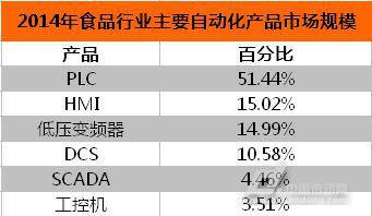 食品行业用到的自动化产品主要包括PLC、HMI、IPC、DCS、SCADA等自动化产品,其中PLC占比较大(51.44%),其次是HMI,占15.02%。