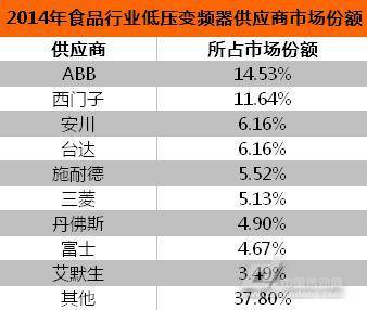 食品行业低压变频器品牌除ABB和西门子外,其他七个品牌的市场份额非常接近,安川和台达甚至份额一样;同时其他品牌共占据37.80%的份额,可见竞争非常激烈,进入的品牌也较多。除台达外,其他八个品牌均外国外品牌,国内品牌机会较少。与PLC及HMI的发展空间一样,低压变频器在食品行业仍然有较大的发展空间,国产品牌的目标主要锁定一些低端设备技术改进的市场。